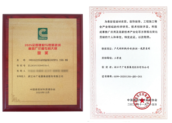 在会议同期举行的颁奖仪式上,中广电器集团凭借技术积淀与创新成果,一举斩获两项重磅科技大奖——旗下“一种能自动设定目标温度的温控器及其控制方法、空调器、地暖”荣获2025全国建材与家居领域高推广价值专利大赛金奖;户式两联供(冷水)机组·境界系列荣获“科学技术奖”三等奖。